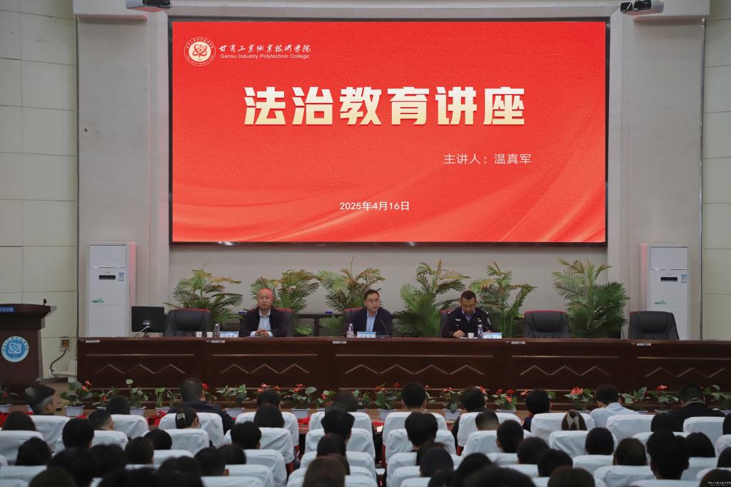 为进一步深化法治校园建设,增强学生的法律意识和法治观念,营造文明、平安、和谐的校园育人环境,4月16日下午,天水市公安局麦积分局花牛派出所所长、甘肃工业职业技术学院法治副校长温真军在图书馆智敏报告厅开展法治安全教育专题讲座。副院长胡森林主持,各二级学院党总支副书记、全体辅导员和学生代表,共300余人参加。