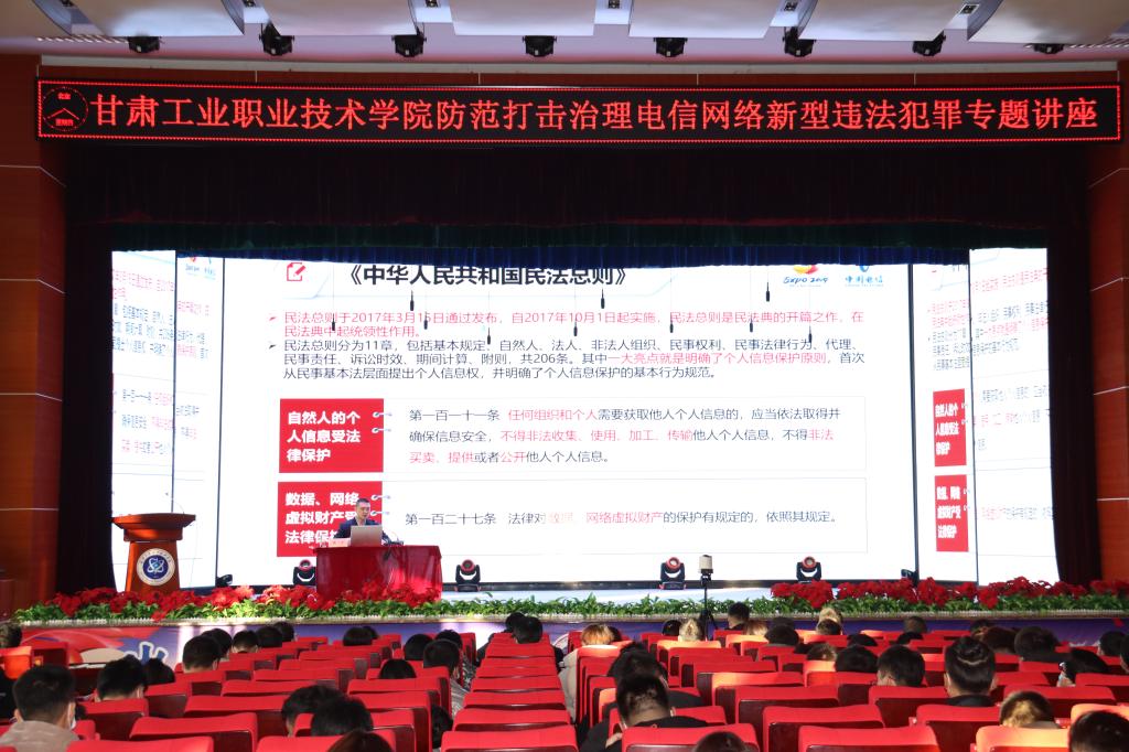 为进一步贯彻落实全省学校安全管理专项整治行动有关要求和省教育厅有关部署,根据《甘肃省教育厅关于印发全省教育系统全面防范电信网络新型违法犯罪工作会议精神的通知(甘教安函【2020】24号)》,结合目前电信网络新型违法犯罪在高校的高发态势,12月10日,学校联合天水市公安局、中国电信天水分公司为我校400余名学生集中开展预防电信网络诈骗专题宣讲会,校学工处、保卫处、团委等部门相关负责同志和部分专职辅导员参会学习。